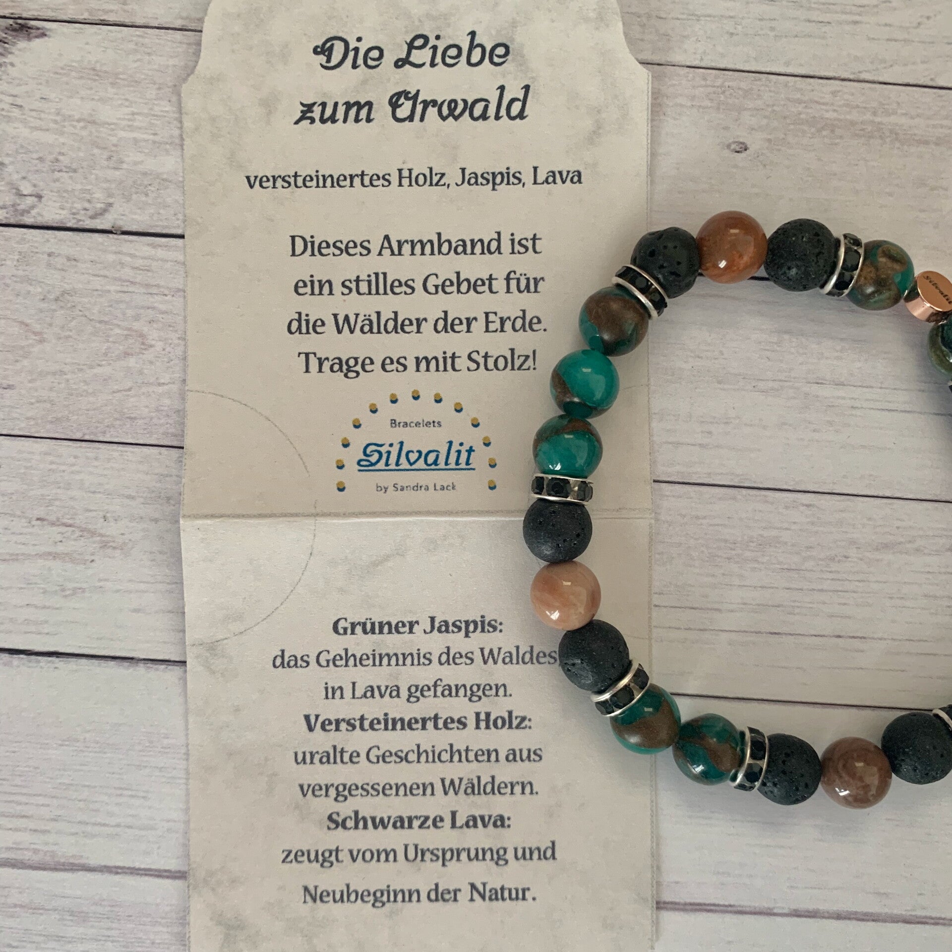 Edelsteinstein Armband Silvalit, Jaspis grün, Lava schwarz, verst. Holz braun