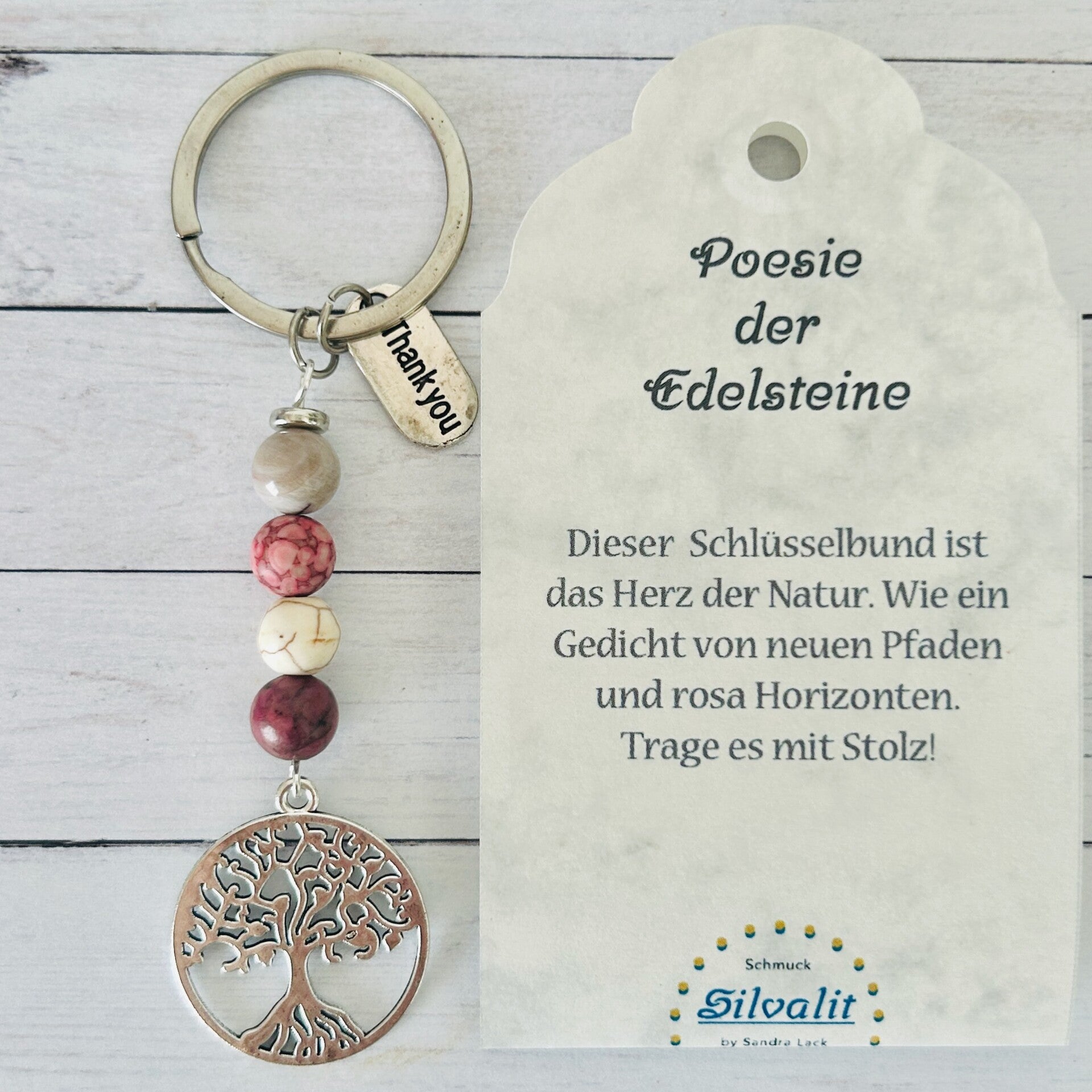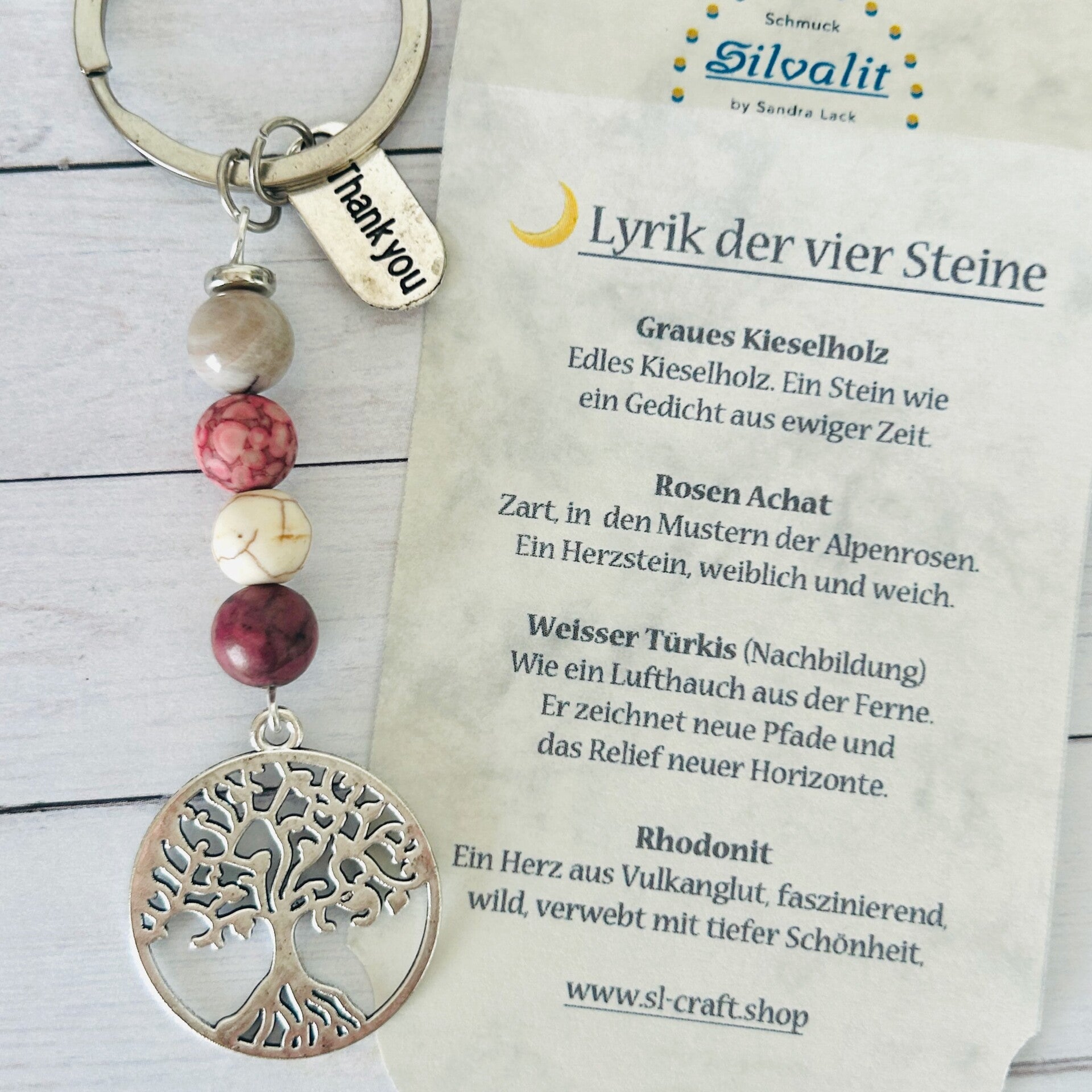 Schlüssel Anhänger Lebensbaum - Rhodonit, weiss Türkis, Achat, Kieselholz